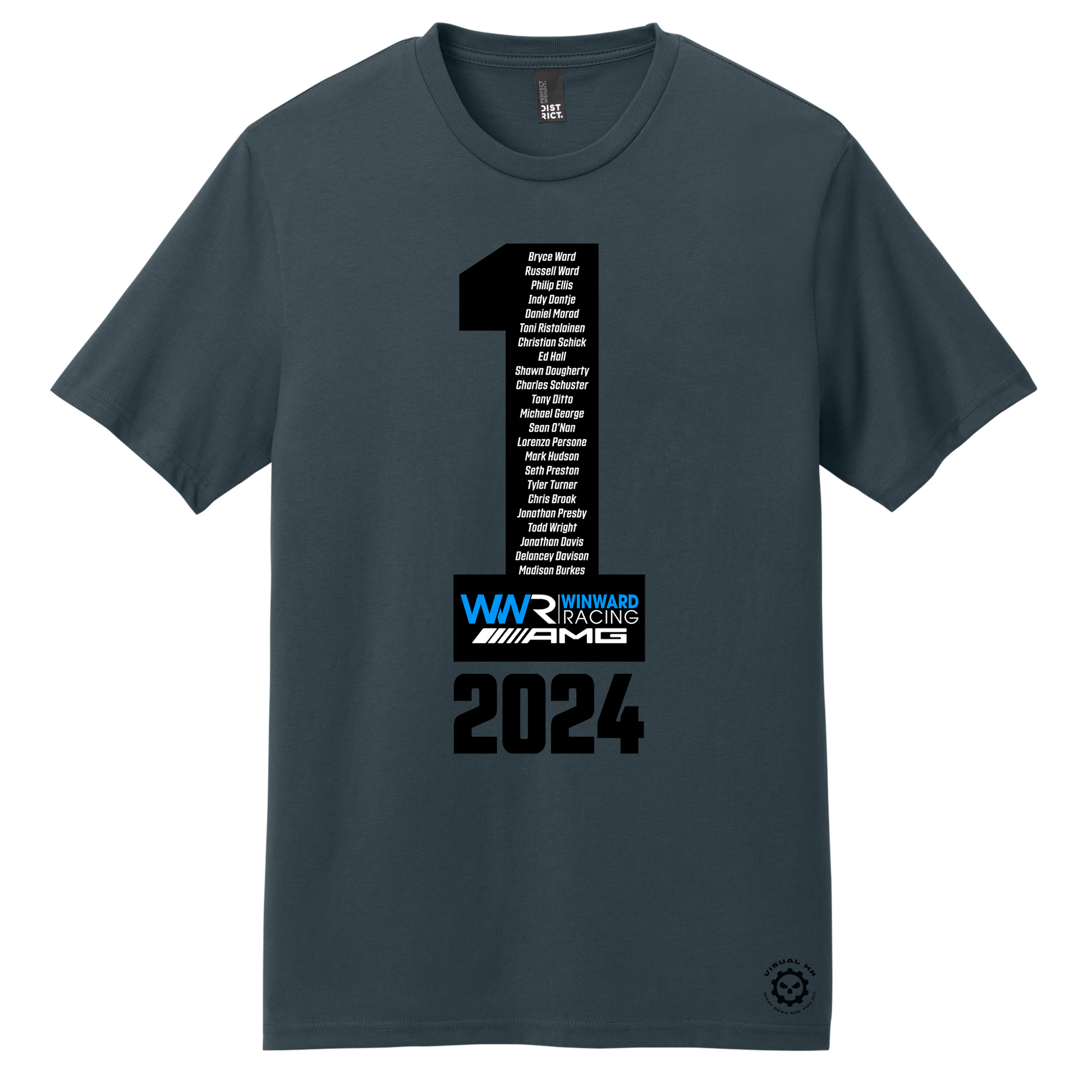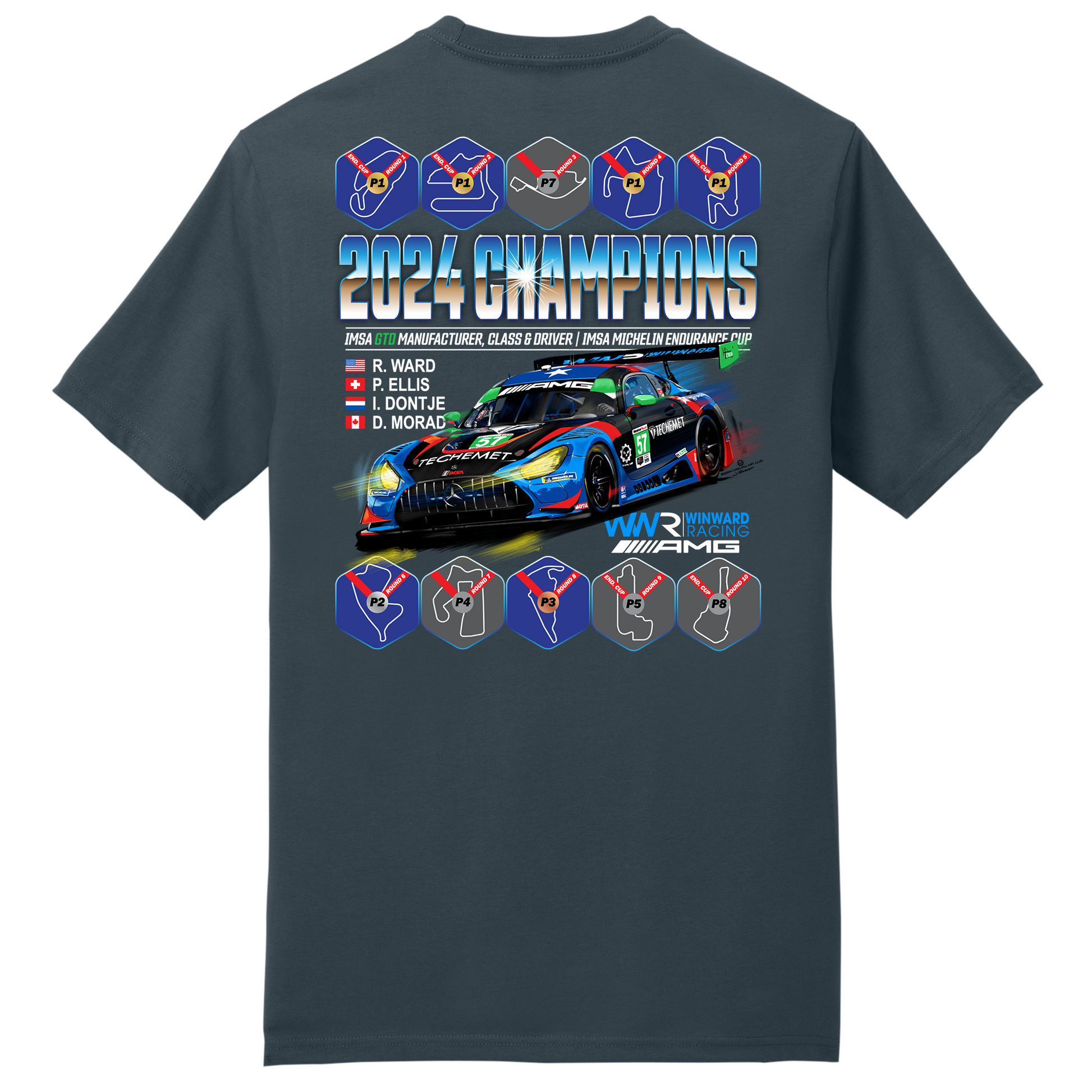 Our latest T-shirt for Winward Racing celebrating their 2024 IMSA GTD manufacturer, driver and class championship victory! The front design has the number 1 with the list of the drivers and team, the WWR Winward Racing Logo! The back features the track outlines from the WeatherTech series, what position they finished in with the podium finishes noted in Winward Blue, and of course, the championship-winning Mercedes AMG GT3 and her pilots from the 2024 season. This eye-catching design is definitely a must-have to celebrate Winward's incredible 2024 season!