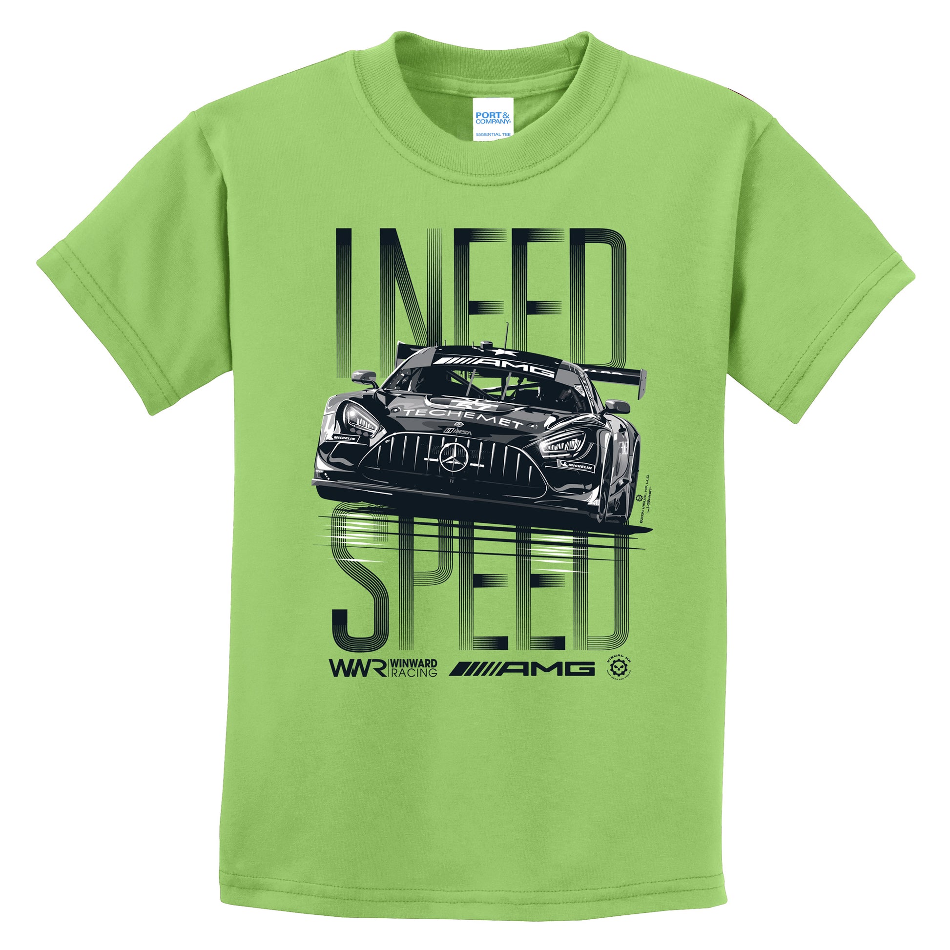 Introduce your young ones to the world of high-speed racing with our bold "I NEED SPEED" Lime Youth Tee. Made with 100% cotton and featuring a vibrant lime green color, this PC61Y youth tee showcases a 3 color print of the Winward Racing AMG GTD championship-contending car and Mercedes AMG logos for a "real racing" feel.